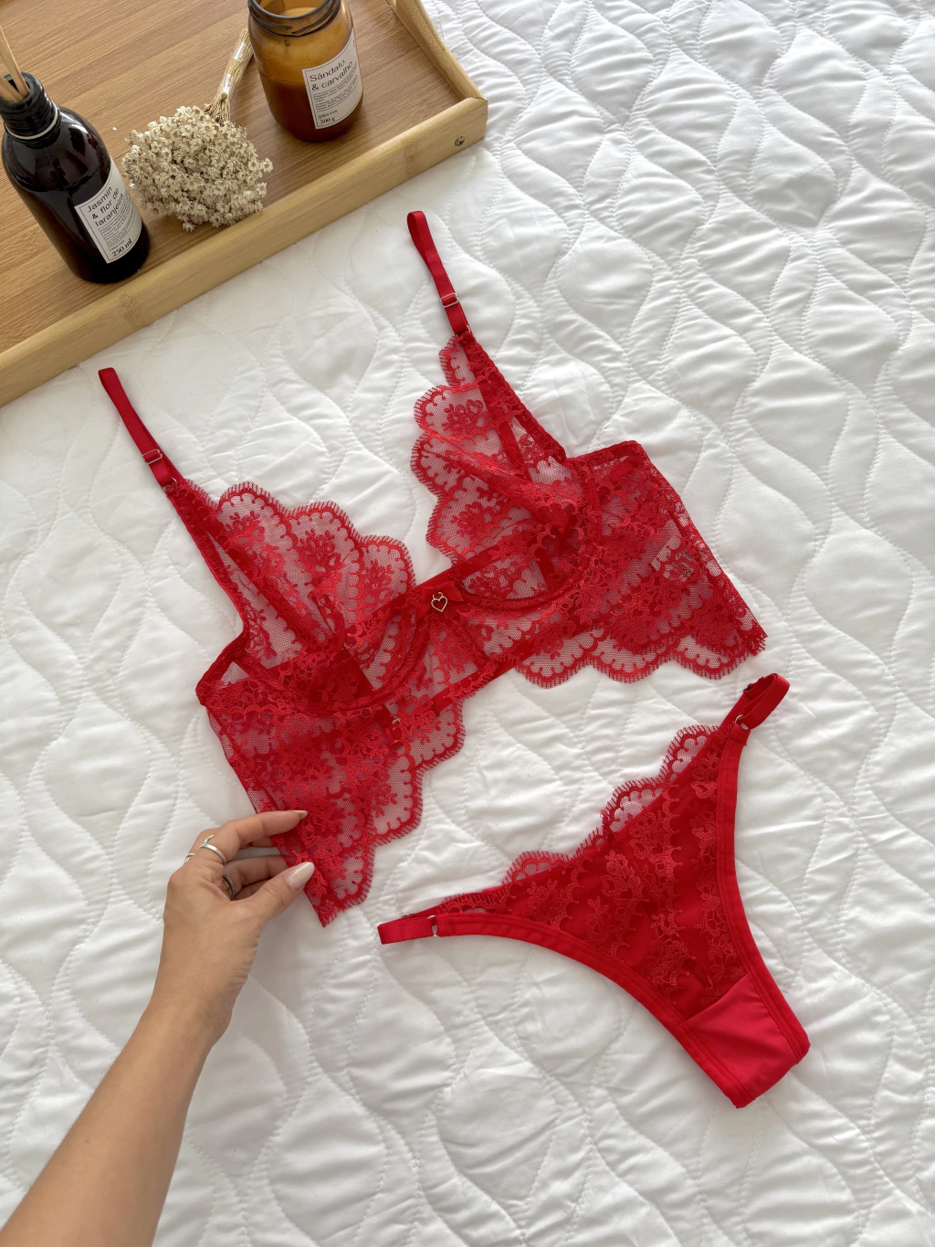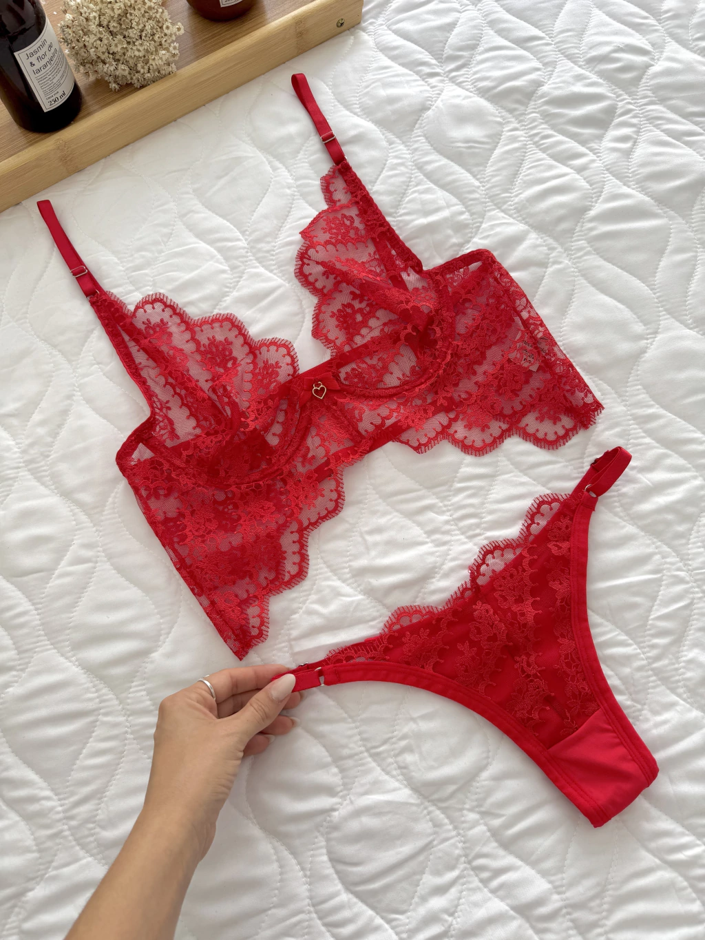 Esse conjunto é confeccionado com materiais de alta qualidade, sendo composto por Tule Bordado, alças reguláveis para um ajuste perfeito e aro que garante a sustentação sem abrir mão do conforto. A peça não possui bojo, mas utiliza tule para oferecer um toque delicado e suave à pele. A calcinha também é ajustável, proporcionando um melhor ajuste ao corpo. O Sutiã possui arco para susentação, garantindo conforto e segurança, com um toque de sensualidade.