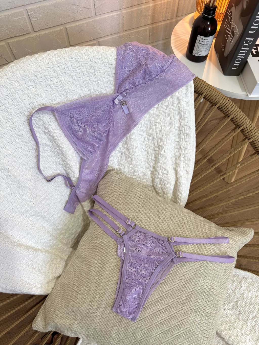 Esse conjunto é confeccionado com materiais de alta qualidade, sendo composto por renda poliamida, alças reguláveis para um ajuste perfeito que garante a sustentação sem abrir mão do conforto. A peça não possui bojo, mas utiliza renda para oferecer um toque delicado e suave à pele. A calcinha também é ajustável, proporcionando um melhor ajuste ao corpo. O Sutiã não possui arco para susentação, garantindo conforto e segurança, com um toque de sensualidade.