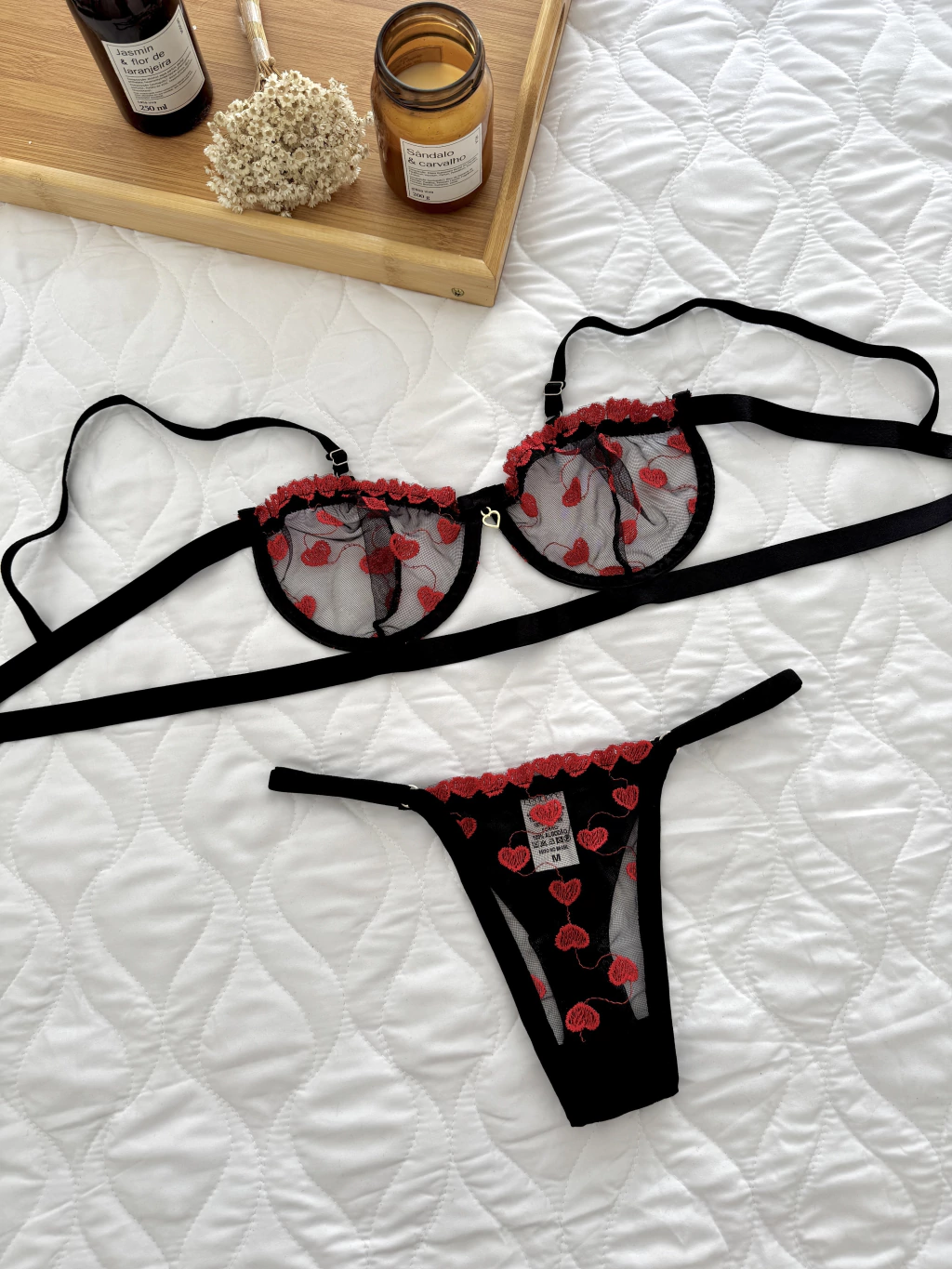 Esse conjunto é confeccionado com materiais de alta qualidade, sendo composto por renda poliamida com elastano, alças reguláveis para um ajuste perfeito e aro que garante a sustentação sem abrir mão do conforto. A peça não possui bojo, mas utiliza tule bordado para oferecer um toque delicado e suave à pele. A calcinha também é ajustável, proporcionando um melhor ajuste ao corpo. O Sutiã possui arco para susentação, garantindo conforto e segurança, com um toque de sensualidade.